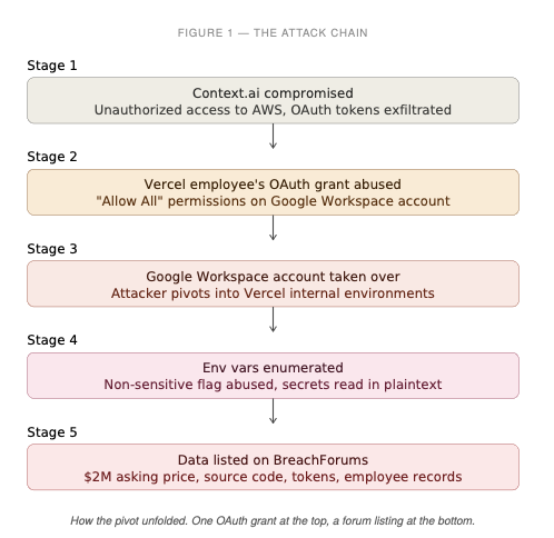 A Vercel employee clicked a button on an AI office suite called Context.ai and granted it "Allow All" permissions against their Google Workspace account. Weeks later, attackers who had compromised Context.ai used that OAuth grant to walk into Vercel's Google Workspace, pivot into the employee's Vercel account, enumerate environment variables that weren't flagged "sensitive," and list the loot for sale on BreachForums for $2M.
