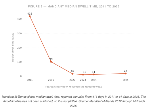 3. Once an attacker has a valid OAuth token and an LLM, the time needed to understand a target environment drops. Reading thousands of documents, mapping relationships between accounts and services, identifying which env vars smell like secrets, and drafting convincing follow-on phishing are now cheap operations. The Vercel bulletin describes the attacker as having "operational velocity and detailed understanding" of internal systems. That phrasing is doing real work. The median dwell time trend below shows that defenders have gotten faster at detection, but the reverse is also true on offense. The gap between "token stolen" and "loot staged for sale" is collapsing on both sides of the line.