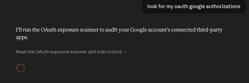 OAuth Exposure Scanner - a free Claude Skill A read-only audit of every third-party app connected to your Google account. It runs entirely inside your own browser, using Claude in Chrome, against the page you would visit yourself at myaccount.google.com/permissions . No copy-paste. No new login. No OAuth grant. No API call to Google.